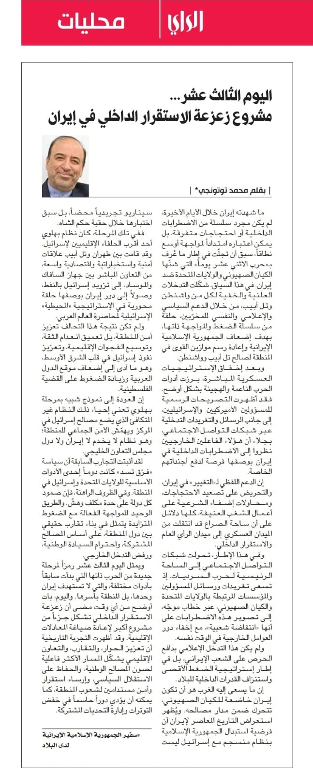انتشار مقاله روز سیزدهم؛ پروژه ناآرام سازی داخلی ایران به قلم سفیر کشورمان