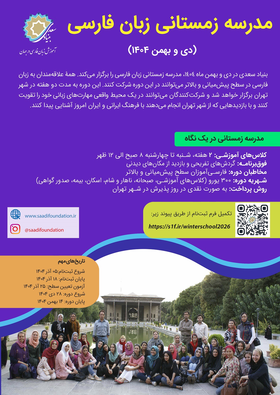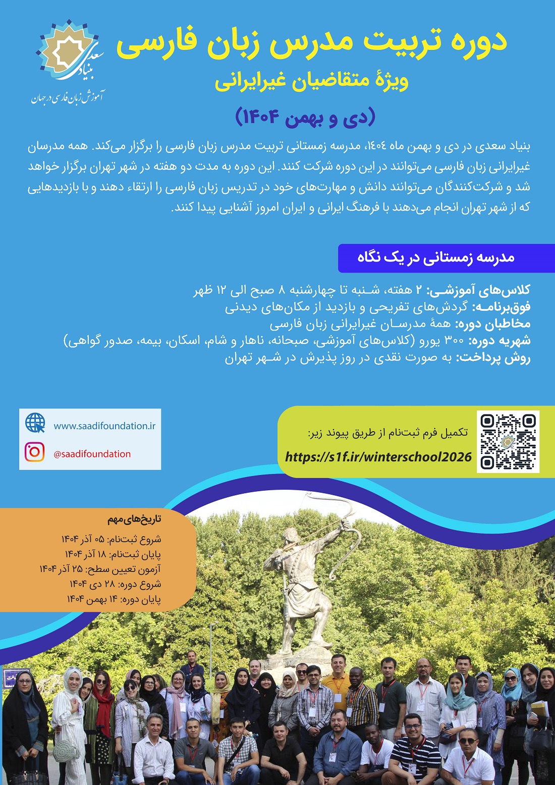 بنیاد سعدی در نظر دارد در دی ماه و بهمن ماه سال جاری مدرسه زبان فارسی را برای علاقمندان به یادگیری این زبان و مدرسان غیر ایرانی زبان فارسی در تهران برگزار نماید. علاقمندان جهت شرکت در این دوره‌ها می‌توانند به سایت www.saadifoundation.ir مراجعه فرمایند.
